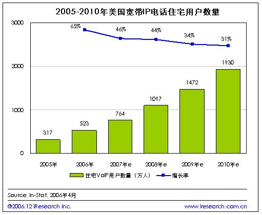 iResearch艾瑞市場(chǎng)咨詢根據(jù)In-Stat的調(diào)查數(shù)據(jù)整理發(fā)現(xiàn),2005年美國(guó)住宅VoIP用戶數(shù)量為317萬,到今年年底這一數(shù)字將達(dá)到523萬,比上年增長(zhǎng)65%.隨著寬帶互聯(lián)網(wǎng)接入的持續(xù)普及,據(jù)預(yù)測(cè)到2007年將有764萬美國(guó)家庭使用寬帶接入的IP電話。