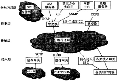 業(yè)務(wù)/應(yīng)用層:業(yè)務(wù)層主要指面向用戶提供各種應(yīng)用和服務(wù)的設(shè)備。采用開放、綜合的業(yè)務(wù)接入平臺,為下一代網(wǎng)絡(luò)提供各種增值業(yè)務(wù)、多媒體業(yè)務(wù)和第三方業(yè)務(wù),還具有相應(yīng)的業(yè)務(wù)生成和維護(hù)環(huán)境。業(yè)務(wù)層可能包括應(yīng)用服務(wù)器、AAA服務(wù)器、業(yè)務(wù)控制點(diǎn)(SCP)、策略服務(wù)器、第三方服務(wù)器。