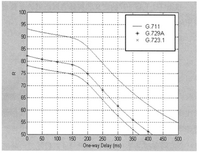 Datagram Protocol)協(xié)議進(jìn)行傳輸[1]。近年來,隨著IP網(wǎng)絡(luò)技術(shù)的廣泛應(yīng)用,VoIP成為一種新興的電話通信方式,IP網(wǎng)絡(luò)所提供的語音質(zhì)量問題受到人們的普遍關(guān)注,如何對(duì)語音質(zhì)量進(jìn)行科學(xué)可靠的測(cè)量和評(píng)價(jià)是網(wǎng)絡(luò)測(cè)量和網(wǎng)絡(luò)規(guī)劃設(shè)計(jì)中十分關(guān)鍵的問題。E-Model作為語音質(zhì)量測(cè)量的一種新方法,它適合數(shù)據(jù)網(wǎng)絡(luò)的語音質(zhì)量測(cè)量,必將有廣泛的應(yīng)用。本文將在E模型下分析延時(shí)、噪聲、回音和語音壓縮等對(duì)VoIP語音質(zhì)量的影響。