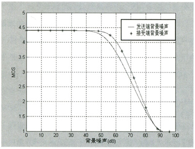 (3)從圖4仿真結(jié)果可以看出,發(fā)送端背景噪聲Ps和接收端背景噪聲Pr對(duì)MOS值的影響:背景噪聲小于40 dB時(shí),對(duì)語音質(zhì)量沒有太大的影響,當(dāng)背景噪聲大于40