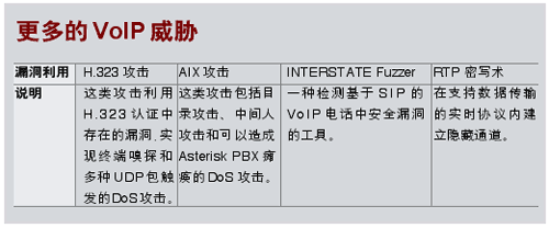 研究人員宣布了針對VoIP信令協(xié)議H.323和AIX的工具,以及將音頻插入到VoIP呼叫中的工具。其中,一款自動探測會話發(fā)起協(xié)議安全漏洞的工具被認(rèn)為能夠在VoIP傳輸流上搭載數(shù)據(jù)。