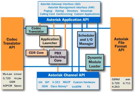 Asterisk具有傳統(tǒng)PBX無法比擬的優(yōu)點(diǎn),那就是其靈活性,可擴(kuò)展能力;Asterisk的擴(kuò)展能力是通過開放相應(yīng)的架構(gòu)和接口來實(shí)現(xiàn)的。這就意味著Asterisk是一個(gè)組件而不是一個(gè)成型的產(chǎn)品,Asterisk的核心提供了一個(gè)基本的可運(yùn)行環(huán)境,而外圍相應(yīng)的能力則可以通過加載和配置相關(guān)的插件和模塊來實(shí)現(xiàn)。