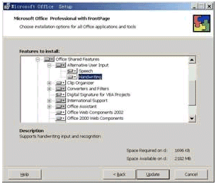 如果是首次使用手寫識別,那么需要通過執(zhí)行自定義安裝來安裝本功能。注意無法從"工具"中找到類似"語音"的"手寫"命令,你只能通過插入Office XP光盤的方法進行自定義安裝,其安裝步驟與安裝自定義安裝語音識別功能一致,不過這次是從"Office 共享功能"旁,單擊"中文可選用戶輸入方式"旁,單擊"手寫輸入"(如圖15所示)。
