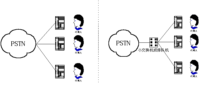 呼叫中心,早期是指一個(gè)由兩人或更多人組成的、在一個(gè)特定地方用專(zhuān)用設(shè)備處理電話(huà)業(yè)務(wù)的小組。這些人就是通常所說(shuō)的呼叫中心代理(人)。一個(gè)呼叫中心可以只提供信息接收服務(wù),或者只提供信息發(fā)送服務(wù),或者是一個(gè)混合式呼叫中心,其呼叫中心代理會(huì)負(fù)責(zé)所有這兩項(xiàng)工作。從物理設(shè)備構(gòu)成來(lái)看,第一代呼叫中心可用下圖(1)、(2)表示。
