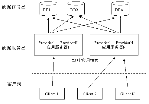 在大規(guī)模系統(tǒng)中,為保證數(shù)據(jù)庫(kù)訪問(wèn)的效率和安全性,數(shù)據(jù)訪問(wèn)方式一般采用由Client、中間層應(yīng)用服務(wù)器(或叫規(guī)則服務(wù)器)和Server組成的三層Client/Server結(jié)構(gòu)。將數(shù)據(jù)庫(kù)應(yīng)用劃分為邏輯上的三個(gè)層次,客戶程序只關(guān)心數(shù)據(jù)的顯示與用戶界面;應(yīng)用服務(wù)器處理客戶數(shù)據(jù)查詢與更新請(qǐng)求,可在應(yīng)用服務(wù)器上定義數(shù)據(jù)操作規(guī)則以保證數(shù)據(jù)操作的合法性、安全性與有效性。在三層結(jié)構(gòu)下,方便了軟件的修改和模塊的疊加,客戶端通過(guò)應(yīng)用服務(wù)器訪問(wèn)數(shù)據(jù)庫(kù)服務(wù)器,客戶端并不直接與數(shù)據(jù)庫(kù)服務(wù)器建立連接,從而減輕了數(shù)據(jù)庫(kù)服務(wù)器的壓力,提高整個(gè)應(yīng)用系統(tǒng)的運(yùn)行效率。