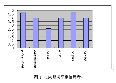 該調(diào)查還發(fā)現(xiàn),UM早期使用者將是在家辦公者,移動(dòng)辦公專(zhuān)業(yè)人群、早期受眾、筆記本電腦使用者、一般人群、從事金融工作的人群,他們的使用傾向度如圖1所示,值越高表示越愿意使用。
