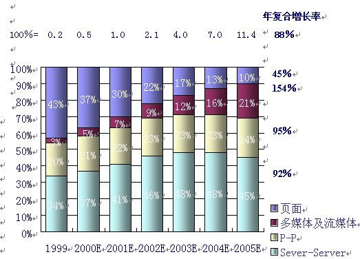 同時(shí),人們對(duì)P-P的互動(dòng)及多媒體的傳輸?shù)男枨髮⒊蔀榫W(wǎng)絡(luò)使用的2個(gè)最主要的發(fā)展趨勢(shì)。據(jù)麥肯錫公司和JP摩根的分析和預(yù)測(cè),多媒體及流媒體的IP流量將以每年154%的復(fù)合率增長(zhǎng),而P—P的IP流量將以95%的年復(fù)合增長(zhǎng)率增長(zhǎng),這2項(xiàng)將成為用戶(hù)需求增長(zhǎng)最快的業(yè)務(wù)。如下圖,