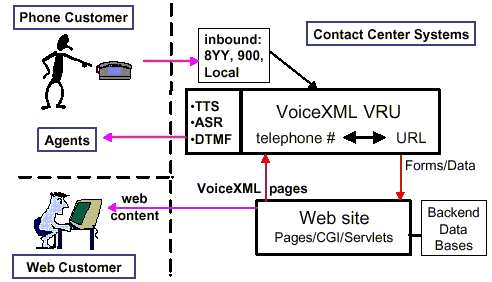 從圖中我們可以看出,同傳統(tǒng)的INTERNET網(wǎng)站相比,在不需要太大的改動(dòng)前提下,只要增加一個(gè)VoiceXml的服務(wù)器處理來(lái)自PSTN的應(yīng)用即可。在VoiceXml的服務(wù)器中,包含了VoiceXml的解釋器(VoiceXml解釋程序語(yǔ)境),VoiceXml自帶的瀏覽器,自動(dòng)語(yǔ)音識(shí)別(ASR)及文本到語(yǔ)音(TTS)的轉(zhuǎn)換設(shè)備。