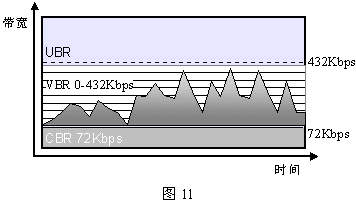 - 可變比特速率(VBR:Variable Bit Rate):允許隨時(shí)可變的帶寬,但必須指定峰值帶寬、最大突發(fā)數(shù)據(jù)長(zhǎng)度和必須維持的最低速率。