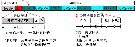圖中清楚地顯示了一個(gè)ATM信元中傳輸多路話音的情形。其中的各CPS-PH+CPS-PP相當(dāng)于該ATM信元所在VC中的微通道(Mini-Channel),這就允許選擇最佳的分組尺寸以獲得最小時(shí)延,同時(shí)允許多個(gè)活動(dòng)AAL2微通道有效地復(fù)用在一個(gè)VC中,從而提高帶寬效率。