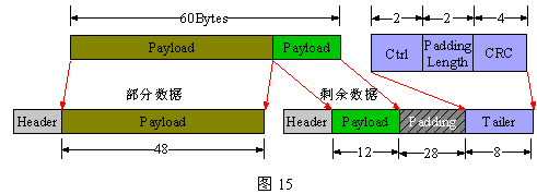 AAL5的信元格式,如下圖15所示。圖中給出了一個(gè)60字節(jié)的數(shù)據(jù)塊通過(guò)兩個(gè)ATM信元傳送的例子。