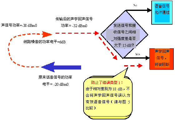 當(dāng)通信鏈路的的另一端被設(shè)計(jì)為傳輸可變強(qiáng)度的信號(hào)時(shí),"錯(cuò)誤類型1"的影響會(huì)急劇增大。在這種情況下,根據(jù)功率電平的絕對(duì)差異來(lái)決定阻斷/允許信號(hào)的聲學(xué)回聲控制器會(huì)增大"錯(cuò)誤類型1"出現(xiàn)的可能性。也就是說(shuō),使用絕對(duì)功率電平差異時(shí),將聲學(xué)回聲信號(hào)誤認(rèn)為有效語(yǔ)音信號(hào)的概率很大。