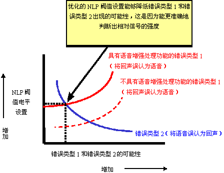 dB)能夠顯著降低將雙對(duì)話語(yǔ)音信號(hào)誤認(rèn)為聲學(xué)回聲信號(hào)的概率,從而防止了"錯(cuò)誤類型2"?傊"錯(cuò)誤類型1"(實(shí)線曲線,具有語(yǔ)音增強(qiáng)特性)和"錯(cuò)誤類型2"曲線的交叉點(diǎn)上,通過(guò)與之對(duì)應(yīng)的NLP設(shè)置,可以獲得最佳的性能(請(qǐng)參見圖10)。