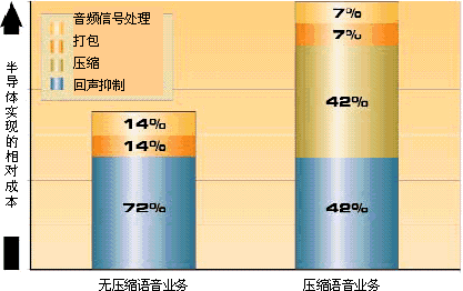 如圖4所示,是一個(gè)典型VoP系統(tǒng)大約的相對成本構(gòu)成。第一根柱圖代表無壓縮語音業(yè)務(wù),而第二根柱圖代表壓縮語音業(yè)務(wù)。這個(gè)柱形圖說明:回聲抑制和壓縮是實(shí)現(xiàn)這類網(wǎng)關(guān)的語音處理技術(shù)中成本最高的兩個(gè)功能。如果這兩種業(yè)務(wù)功能通過某一技術(shù)實(shí)現(xiàn)而能在密度和功耗方面得到一個(gè)數(shù)量級性質(zhì)的改善,那麼人人都能從中受惠。