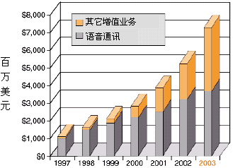 為了獲得競爭優(yōu)勢,業(yè)務(wù)提供商──傳統(tǒng)長途運(yùn)營和本地交換運(yùn)營商,因特網(wǎng)業(yè)務(wù)提供商(ISP),應(yīng)用業(yè)務(wù)提供商,以及無線運(yùn)營商──都在想方設(shè)法發(fā)布基于IP的業(yè)務(wù),這些業(yè)務(wù)應(yīng)該:對用戶有較高的價(jià)值,能縮短面市所需時(shí)間,部署是低成本高效益的。向用戶提供高價(jià)值的增值業(yè)務(wù)能為業(yè)務(wù)提供商帶來重要的收入源泉,并使他們更有特色,增加市場分額,特別是如果這些業(yè)務(wù)以快速、易于支持的方式部署,以上這些優(yōu)勢就會更加突出。據(jù)估計(jì),到2003年增值業(yè)務(wù)設(shè)備僅在美國就能達(dá)到73億美元的市場,正如圖1所示。