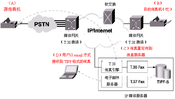 T.38規(guī)定了實(shí)時(shí)IP傳真的標(biāo)準(zhǔn)。因此,源于PSTN的一個(gè)傳真會話能夠以T.38的格式進(jìn)入IP網(wǎng)絡(luò)。在IP媒體服務(wù)器中通過使用T.30,T.38和T.37,實(shí)時(shí)傳真會話可以把IP媒體服務(wù)器作為終端,并把實(shí)時(shí)傳真轉(zhuǎn)換成T.37兼容的傳真消息。然后,這個(gè)傳真消息會被用來產(chǎn)生一個(gè)就象一個(gè)電子郵件會話的T.37傳真。這使得IP媒體服務(wù)器可以提供"永不示忙"的IP傳真功能。這個(gè)功能也將為統(tǒng)一消息應(yīng)用提供基于IP的傳真郵箱能力。