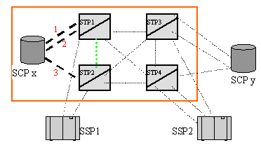 圖中紅色框內(nèi)的網(wǎng)絡包括SCPx,STP1和STP2三個信令點。鏈路1和2構成SCPx和STP1之間的鏈路集。鏈路3構成SCPx和STP2之間的鏈路集。
