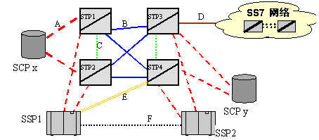 D鏈路是對(duì)角鏈路,是指通過(guò)STP連接到其它SS7網(wǎng)絡(luò)的鏈路。圖中棕色線條所示。