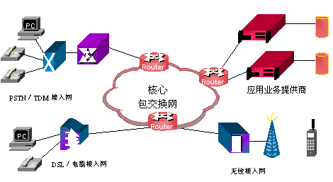 未來的網(wǎng)絡(luò)將會以基于數(shù)據(jù)包的網(wǎng)絡(luò)為核心,交換系統(tǒng)以IP交換和ATM交換等構(gòu)成,能實現(xiàn)包括語音、數(shù)據(jù)和視頻的所有交換需求。各種接入網(wǎng),如:無線網(wǎng)、有線電纜網(wǎng)、DSL、TDM(時分多路復用)交換網(wǎng)等,通過路由器接入到核心網(wǎng)絡(luò)。