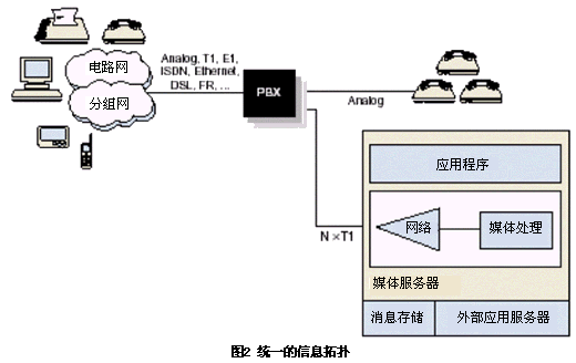 圖2是有前提的典型統(tǒng)一消息拓撲圖。這個例子中媒體服務器管理消息的存儲和提取,這些消息包括語音、傳真、數(shù)據(jù)或視頻。它可以訪問不同媒體文件以及必要的控制規(guī)則以實現(xiàn)各類媒體業(yè)務。可以在本地的媒體服務器上也可以在遠程的集中存儲系統(tǒng)上進行存儲。在這種情況下,能提供語音和傳真資源的統(tǒng)一的消息系統(tǒng)通常和email系統(tǒng)比如微軟的Microsoft