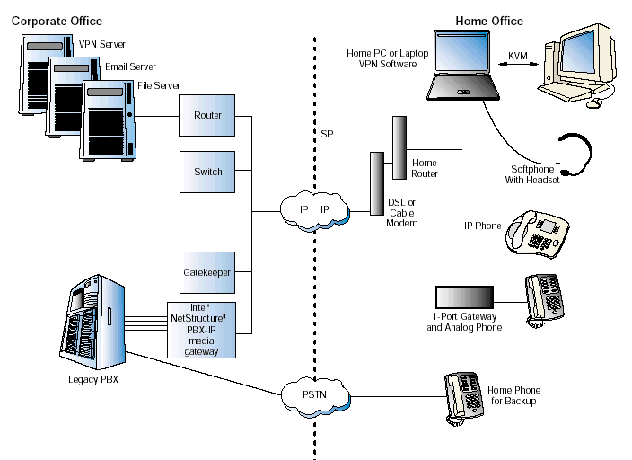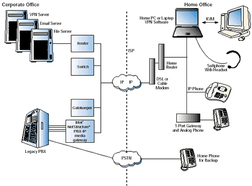 為了實現(xiàn)這個VoIP解決方案,PBX-IP網(wǎng)關(guān)連接到了辦公室里的原有的PBX和關(guān)鍵系統(tǒng)上,還有網(wǎng)守軟件實現(xiàn)一些呼叫的路由以及地址轉(zhuǎn)換。然后遠(yuǎn)程辦公者連接到了網(wǎng)關(guān)上--最終連接到公司PBX上--或者使用IP軟電話,或者一個實際的IP電話,或者一個單端家庭網(wǎng)關(guān)連接到模擬耳機(jī)上。