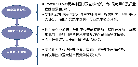 Frost & Sullivan 和 CTI論壇(www.kpskgd.com)共同組成的調研小組,在查閱了大量資料的基礎之上,以企業(yè)通信及呼叫中心的設備應用、投資計劃以及相關廠商的市場表現(xiàn)為出發(fā)點,通過對企業(yè)通信及呼叫中心重要應用企業(yè)、在市場占主導地位的二十多家設備廠商、二十多家軟件開發(fā)商、十幾家系統(tǒng)集成商、數(shù)家外包運營商的深度訪談,參閱內部相關報告及數(shù)據(jù)庫,對數(shù)據(jù)的來源和數(shù)據(jù)的準確性進行了詳細核對與論證;憑借參與調研人員的多年從業(yè)經
